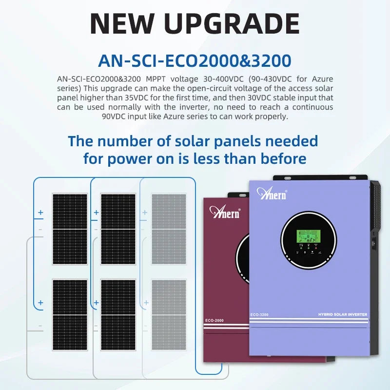 3. The MPPT voltage is 30-400VDC (90-430VDC for Azure series solar inverters), this upgrade allows the open circuit voltage of the connected solar panels to be higher than 35VDC for the first time, followed by a stable input of 30VDC for normal use of the inverter, meaning that less solar panels are needed to power on than before.